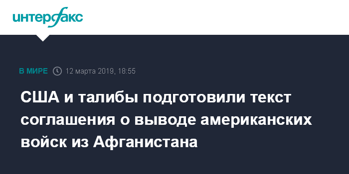 Москва. 12 марта. INTERFAX.RU - Представители США и движения "Талибан" (запрещено в РФ) на переговорах в Катаре подготовили проект соглашения, в котором, в частности, говорится о выводе американских войск из Афганистана, сообщил афганский телеканал Tolo News со ссылкой на источники.