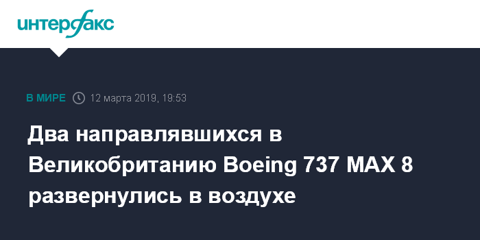 Москва. 12 марта. INTERFAX.RU - Два самолета Boeing 737 MAX 8, направлявшихся из Турции в Великобританию, были вынуждены развернуться в воздухе из-за введенного во вторник запрета на полеты данных видов авиалайнеров в британском воздушном пространстве, сообщает The Independent.