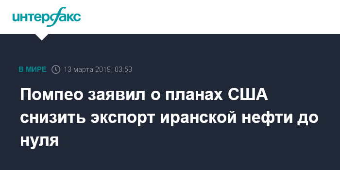 Москва. 13 марта. INTERFAX.RU - США намерены довести экспорт иранской нефти до нуля, заявил госсекретарь Майк Помпео, выступая на конференции CERAWeek в Хьюстоне.