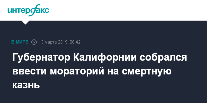 Москва. 13 марта. INTERFAX.RU - Губернатор Калифорнии Гэвин Ньюсом в среду подпишет указ, который введет мораторий на смертную казнь в штате, сообщает во вторник NBC News.