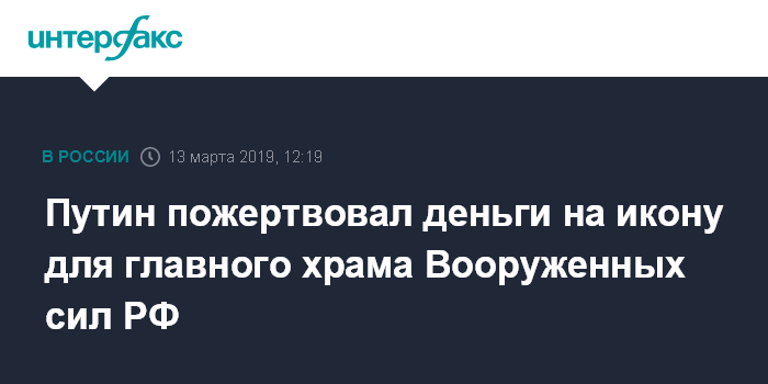 Москва. 13 марта. INTERFAX.RU - В Кремле подтвердили факт пожертвования президентом РФ Владимиром Путиным личных средств на создание центральной иконы главного собора Вооруженных сил РФ, но не стали уточнять сумму.