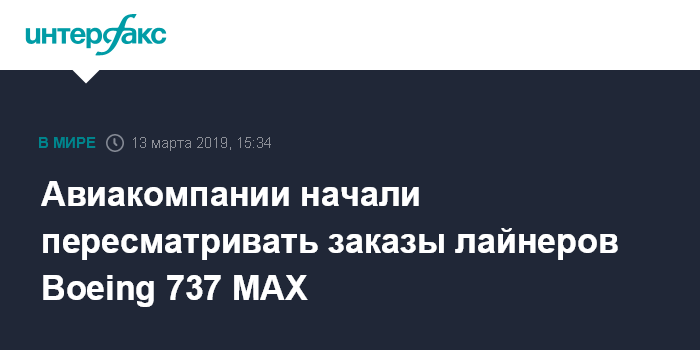 Москва. 13 марта. INTERFAX.RU - Ряд авиакомпаний может отказаться от покупки самолетов Boeing 737 MAX, предназначенных для среднемагистральных маршрутов, после второй аварии за пять месяцев в пользу других моделей американской компании или лайнеров ее главного конкурента - Airbus.