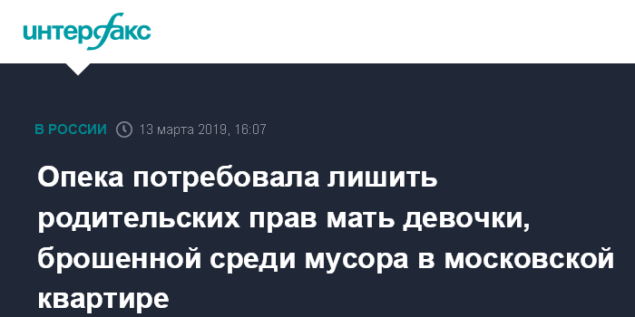 Москва. 13 марта. INTERFAX.RU - Уполномоченный при президенте России по правам ребенка Анна Кузнецова заявила, что органы опеки обратились в суд для лишения родительских прав или ограничения в родительских правах матери девочки, найденной в антисанитарных условиях в московской квартире.