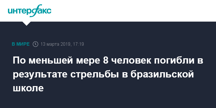Москва. 13 марта. INTERFAX.RU - По меньшей мере, восемь человек погибли в результате стрельбы в одной из школ штата Сан-Паулу в Бразилии, сообщает агентство "Аженсия Бразил".