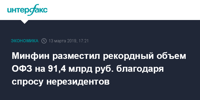 Москва. 13 марта. INTERFAX.RU - Минфин РФ в среду, 13 марта, благодаря спросу нерезидентов разместил на еженедельных первичных аукционах рекордный объем облигаций федерального займа (ОФЗ) - на 91,434 млрд рублей. Таким образом, несмотря на сохраняющиеся санкционные риски, инвесторы не боятся вкладываться в российские долговые бумаги.