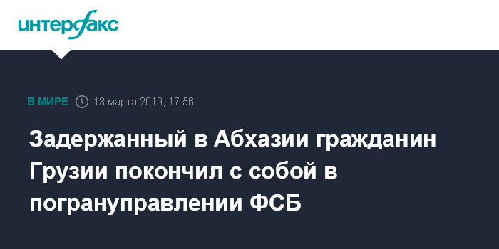 Москва. 13 марта. INTERFAX.RU - Гражданин Грузии, задержанный в Абхазии 10 марта за незаконное пересечение абхазо-грузинской границы, покончил с собой в служебном помещении погрануправления ФСБ России, сообщает в среду Служба госбезопасности (СГБ) Абхазии.