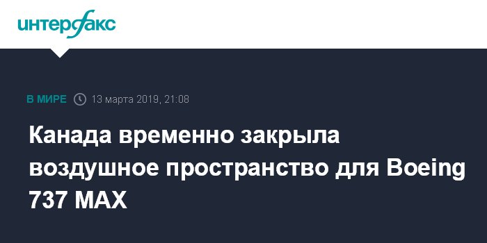 Москва. 13 марта. INTERFAX.RU - Канада вводит временный запрет на полеты в своем воздушном пространстве самолетов типа Boeing 737 MAX 8 и Boeing 737 MAX 9 после авиакатастрофы в Эфиопии, сообщил в среду министр транспорта страны Марк Гарно.