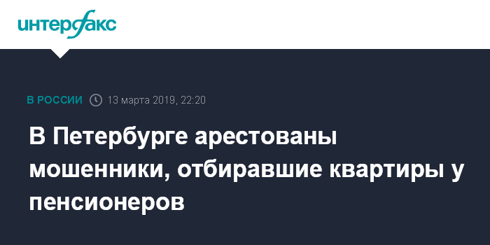 Как сообщалось, Главное следственное управление СКР по Петербургу расследует уголовное дело о деятельности преступной группы, присваивавшей квартиры одиноких пенсионеров и ветеранов. Дело находится в производстве по статье о мошенничестве в особо крупном размере. Оно было возбуждено по результатам личного приема граждан председателем СКР Александром Бастрыкиным.