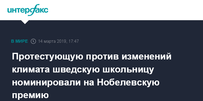 Москва. 14 марта. INTERFAX.RU - Шведская школьница, которая получила известность благодаря акциям протеста против глобальных изменений климата, была номинирована на Нобелевскую премию мира. Как сообщает "Би-би-си", кандидатуру Греты Тунберг выдвинули трое норвежских парламентариев.