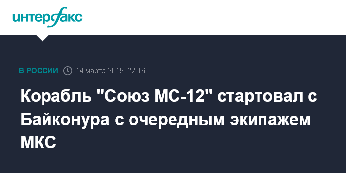 Москва. 14 марта. INTERFAX.RU - Ракета-носитель (РН) "Союз" стартовала с космодрома Байконур с кораблем "Союз МС-12", на борту которого экипаж Международной космической станции (МКС) МКС-59/60.