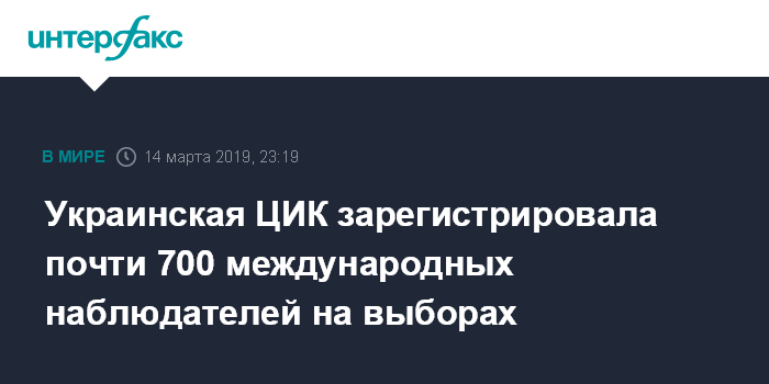 "Таким образом, на 14 марта 2019 года Комиссия зарегистрировала 699 официальных наблюдателей от 10 международных организаций и 7 иностранных государств на очередных выборах президента Украины 31 марта 2019 года", - сказано в сообщении.