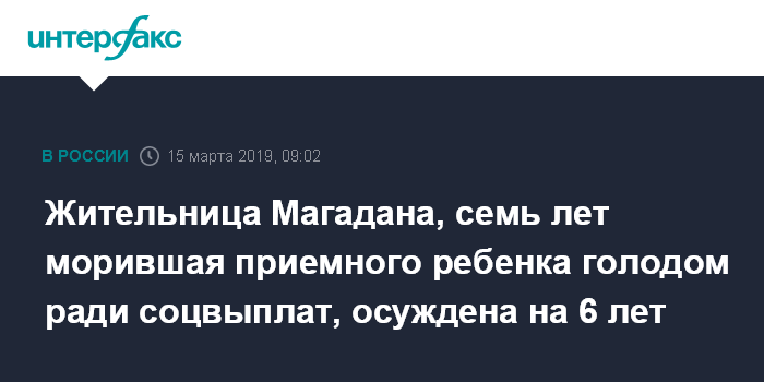 Москва. 15 марта. INTERFAX.RU - Суд в Магаданской области приговорил к шести годам лишения свободы местную жительницу, которая несколько лет морила голодом приемного сына, чтобы получать социальные выплаты, сообщается в пятницу на сайте СКР со ссылкой на официального представителя ведомства Светлану Петренко.