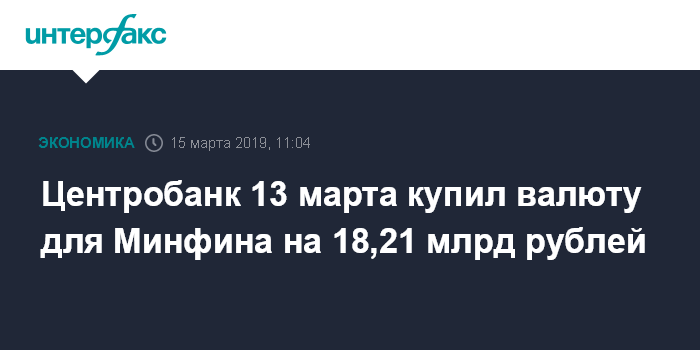 Москва. 15 марта. INTERFAX.RU - ЦБ РФ 13 марта купил валюту для Минфина в рамках бюджетного правила на 18,21 млрд рублей, следует из данных Банка России.