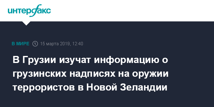 Москва. 15 марта. INTERFAX.RU - Служба государственной безопасности (СГБ) Грузии проверяет сообщения СМИ о том, что на оружии совершивших нападение на мечети в Новой Зеландии среди прочих были надписи на грузинском языке, говорится в заявлении ведомства, опубликованном в пятницу.