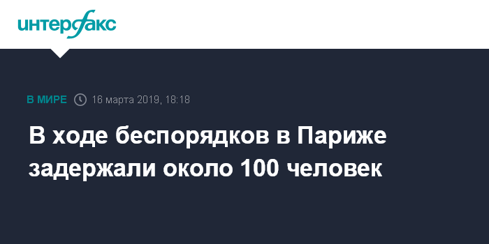 Москва. 16 марта. INTERFAX.RU - Силы правопорядка, противостоящие в субботу участникам массовой акции "желтых жилетов" в Париже, объявили, что к 16:00 местного времени (18:00 по Москве) за противоправные действия были задержаны 94 человека.