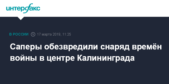 Москва. 17 марта. INTERFAX.RU - Военнослужащие группы разминирования обезвредили в центре Калининграда 152-мм артиллерийский снаряд времён Великой Отечественной войны, сообщает в воскресенье Балтийский флот (БФ).