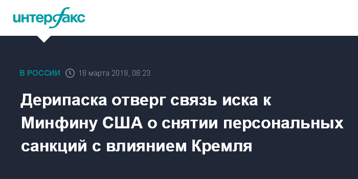 Москва. 18 марта. INTERFAX.RU - Бизнесмен Олег Дерипаска отрицает, что подал иск к Минфину США и его главе Стивену Мнучину, добиваясь отмены введенных против него персональных санкций, по указанию российских властей.