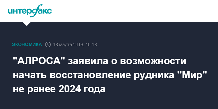 Москва. 18 марта. INTERFAX.RU - Работы по восстановлению рудника "Мир" компании "АЛРОСА" могут начаться не ранее 2024 года. Альтернативой концепции восстановления является полная консервация месторождения, сообщила алмазодобывающая компания.
