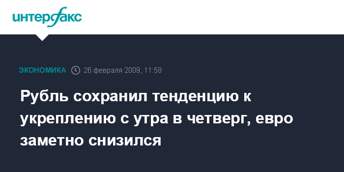 Москва. 26 февраля. INTERFAX.RU - Рубль сохранил с утра в четверг тенденцию к укреплению по отношению к бивалютной коризине, наметившуюся вечером накануне, корзина поднялась до максимума за 9 дней. Доллар при этом снизился на ММВБ незначительно, в то время как снижение курса евро превысило 50 копеек.