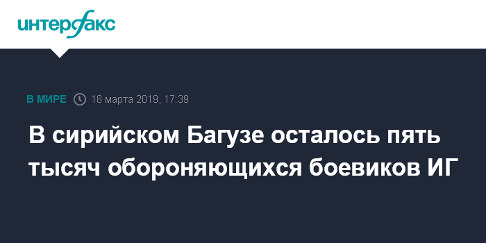Москва. 18 марта. INTERFAX.RU - Порядка пяти тысяч боевиков "Исламского государства" (ИГ, запрещено в РФ) остаются после нескольких месяцев штурма в населенном пункте Багузе - одном из последних оплотов террористической группировки на востоке Сирии, сообщил представитель арабо-курдской коалиции "Сирийские демократические силы" Кино Габриэль.