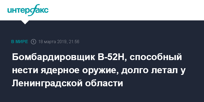 Москва. 18 марта. INTERFAX.RU - Американский стратегический бомбардировщик B-52H Stratofortress, способный нести ядерные крылатые ракеты большой дальности и авиабомбы, в понедельник долго летал вблизи Ленинградской области, следует из данных западных авиадиспетчерских служб.