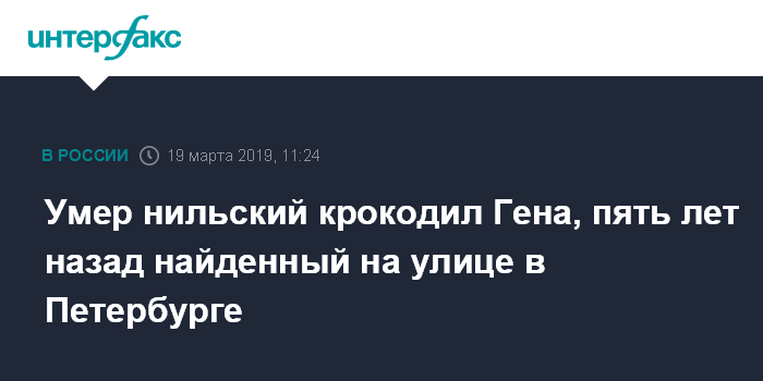 Москва. 19 марта. INTERFAX.RU - Центр помощи животным "Велес" сообщил о смерти крокодила Гены, найденного в 2014 году на улице в Калининском районе Санкт-Петербурга.