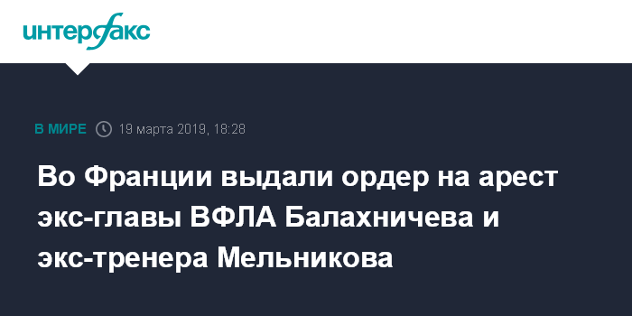 Москва. 19 марта. INTERFAX.RU - Судебные власти Франции выдали ордера на арест бывшего главы Всероссийской федерации легкой атлетики (ВФЛА) Валентина Балахничева и бывшего тренера сборной России по легкой атлетике по группе выносливости Алексея Мельникова, сообщает во вторник французское спортивное издание L"Équipe.