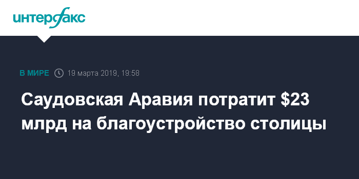 Москва. 19 марта. INTERFAX.RU - Власти Саудовской Аравии планируют направить 86 млрд риялов ($23 млрд) на благоустройство столицы страны - Эр-Рияда.