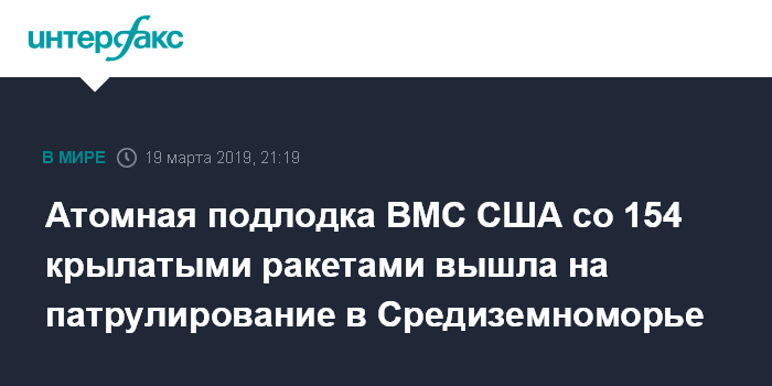 Москва. 19 марта. INTERFAX.RU - Американская атомная подводная лодка "Флорида" (USS Florida (SSGN 728)), находившаяся для пополнения запасов на базе Суда-Бэй на греческом острове Крит, вышла на патрулирование в акваторию Восточного Средиземноморья, следует из мониторинговых данных западных морских ресурсов.