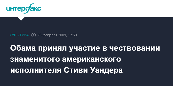 Москва. 26 февраля. INTERFAX.RU - Президент США Барак Обама вручил певцу Стиви Уандеру премию имени Гершвина за лучшую популярную песню. Для этого всемирно известного исполнителя это уже вторая премия, которую присуждает библиотека конгресса США.