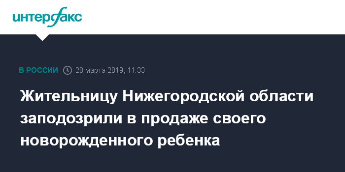 Москва. 20 марта. INTERFAX.RU - Правоохранительные органы Нижегородской области задержали женщину, которая пыталась продать своего новорожденного сына, сообщается на сайте управления СКР по региону в среду.