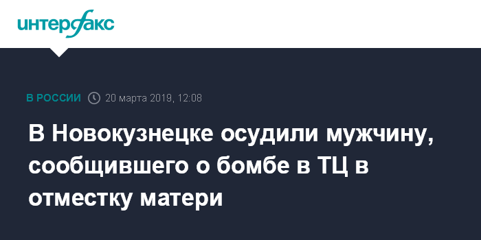 Москва. 20 марта. INTERFAX.RU - Суд в Новокузнецке приговорил к условному сроку 33-летнего местного жителя, который признан виновным в ложном сообщении о готовящемся теракте в торговом центре, сообщает УМВД России по Кемеровской области.