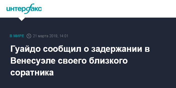 Москва. 21 марта. INTERFAX.RU - Провозгласивший себя временным президентом Венесуэлы оппозиционер Хуан Гуайдо сообщил в четверг о задержании сотрудниками сил безопасности страны руководителя своего аппарата Роберто Марреро.