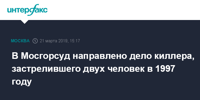 Москва. 21 марта. INTERFAX.RU - Столичная прокуратура направила в суд уголовное дело киллера Роберта Березина, более 20 лет скрывавшегося от следствия после совершения двух убийств в 1997 году.