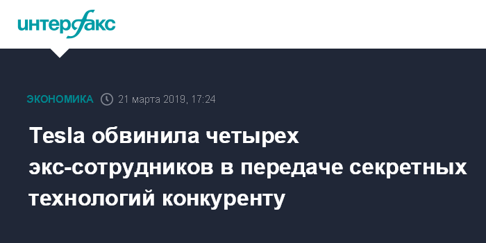 Москва. 21 марта. INTERFAX.RU - Американский производитель электромобилей Tesla Inc подал в суд на четырех своих бывших сотрудников, обвинив их в передаче конфиденциальной информации стартапу Zoox Inc., который занимается разработкой самоуправляемых автомобилей.