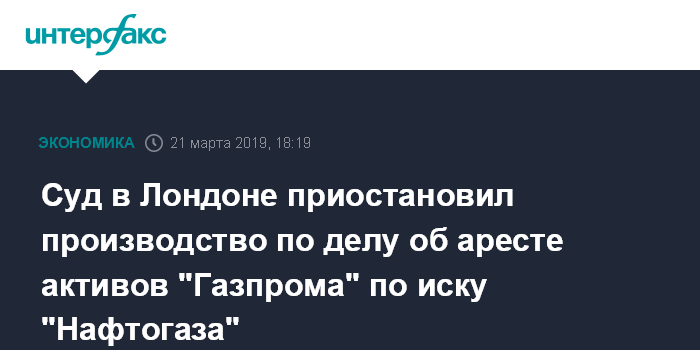 Москва. 21 марта. INTERFAX.RU - Высокий суд Англии и Уэльса 15 марта 2019 года приостановил производство по делу о признании и приведении в исполнение на территории Англии и Уэльса решения Стокгольмского арбитража от 28 февраля 2018 года по разбирательству между "Газпромом" и НАК "Нафтогаз Украины" в рамках контракта на транзит газа, сообщила российская компания.