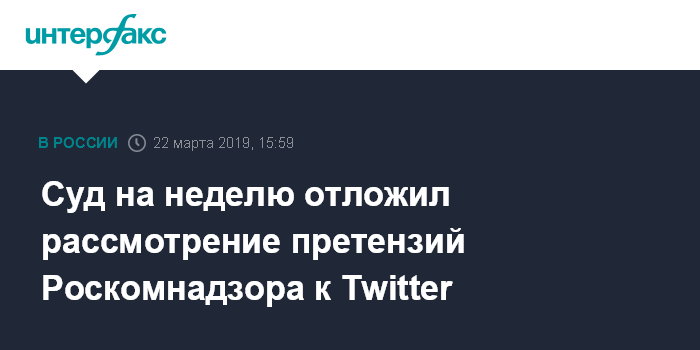 Москва. 22 марта. INTERFAX.RU - Мировой суд Таганского района Москвы отложил на 29 марта рассмотрение административного дела в отношении Twitter об отказе предоставить информацию, связанную с локализацией персональных данных российских пользователей сервиса на территории РФ, передал корреспондент "Интерфакса".