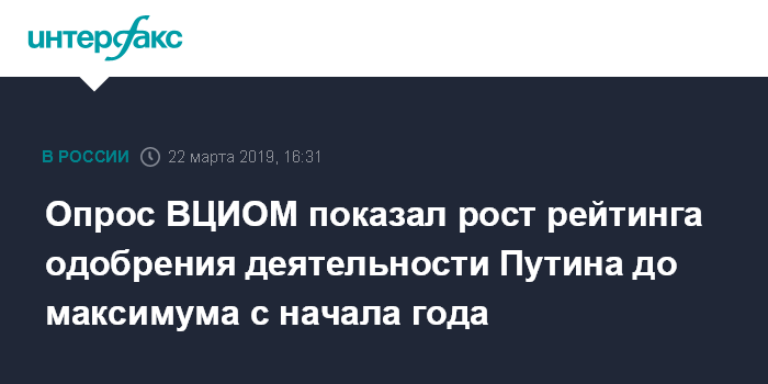 Москва. 22 марта. INTERFAX.RU - Рейтинг одобрения деятельности президента России Владимира Путина по состоянию на 17 марта достиг максимума с начала года, превысив 65%. Об этом свидетельствуют данные опроса ВЦИОМ, поступившие в пятницу в "Интерфакс".