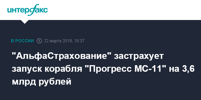 Москва. 22 марта. INTERFAX.RU - Запуск транспортного грузового корабля "Прогресс МС-11" к Международной космической станции будет застрахован в СК "АльфаСтрахование" на 3,58 млрд рублей, говорится в материалах тендера "Роскосмоса" на портале госзакупок.