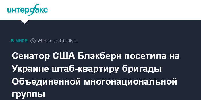 Москва. 24 марта. INTERFAX.RU - Член комитета Сената США по вооруженным силам Марша Блэкберн в субботу, 23 марта, посетила штаб-квартиру бригады Объединенной многонациональной группы по подготовке, где обсудила подготовку и поддержку Соединенными Штатами украинских войск, сообщает посольство США на Украине.