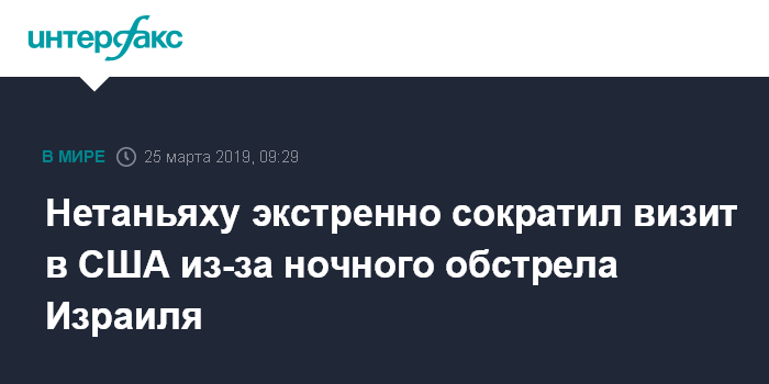 Москва. 25 марта. INTERFAX.RU - Глава правительства Израиля Биньямин Нетаньяху в понедельник объявил о сокращении визита в США и возвращении на родину в связи с ночным обстрелом Израиля с территории сектора Газа, сообщает интернет-портал израильской газеты Jerusalem Post.