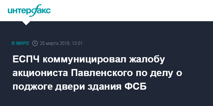 Москва. 25 марта. INTERFAX.RU - Европейский суд по правам человека (ЕСПЧ) направил российским властями вопросы в рамках жалобы художника-акциониста Петра Павленского по делу о поджоге здания ФСБ на Лубянской площади в Москве.