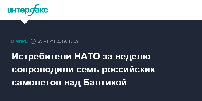 Москва. 25 марта. INTERFAX.RU - На минувшей неделе истребители НАТО, выполняющие миссию Балтийского воздушного патрулирования, шесть раз поднимались в небо, чтобы опознать и сопроводить российские военные самолеты, летевшие в международном воздушном пространстве над Балтийским морем, сообщило в понедельник министерство обороны Литвы.