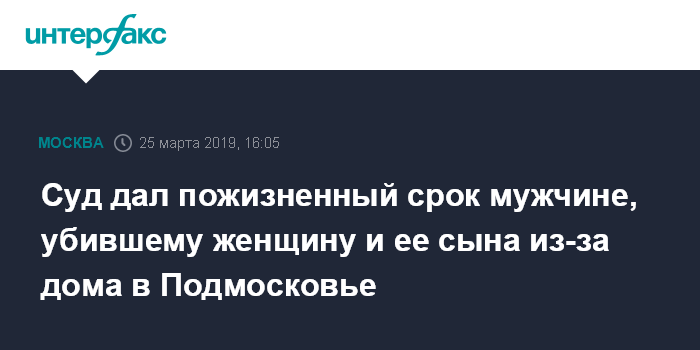 Москва. 25 марта. INTERFAX.RU - Суд в Подмосковье на основании вердикта присяжных заседателей приговорил мужчину, убившего в 2014 году женщину и ее восьмилетнего сына, к пожизненному заключению в колонии строгого режима, сообщила представитель областного главка Следственного комитета (СК) России Ольга Врадий.