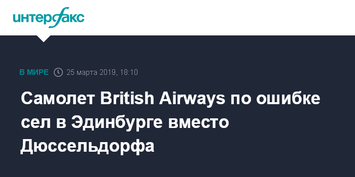 Москва. 25 марта. INTERFAX.RU - Самолет британской авиакомпании British Airways, летевший из Лондона в Дюссельдорф, по ошибке совершил посадку в шотландском городе Эдинбург, сообщает издание Edinburgh News.