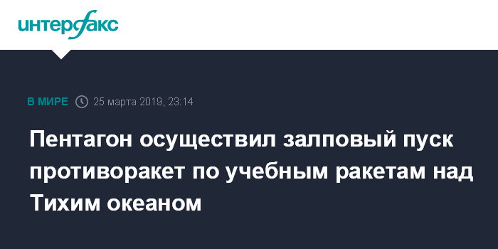 Москва. 25 марта. INTERFAX.RU - США в понедельник провели испытание системы противоракетной обороны континентальной части страны, впервые осуществив залповый пуск двух противоракет на перехват учебных межконтинентальных баллистических ракет вероятного противника, под которым подразумевается Северная Корея или Иран, сообщили калифорнийские СМИ, ссылаясь на источники в Пентагоне.