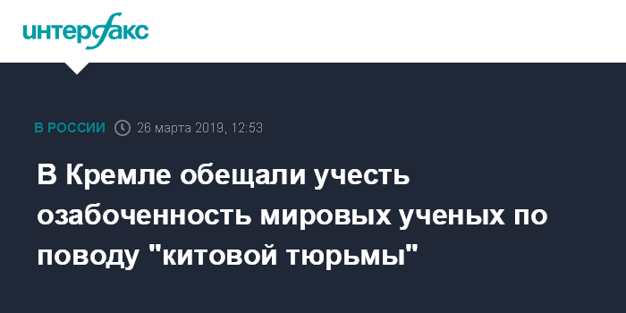 Москва. 26 марта. INTERFAX.RU - Обращение международных ученых относительно судьбы животных, содержащихся в так называемой "китовой тюрьме", будет принято во внимание, заявил пресс-секретарь президента РФ Дмитрий Песков.