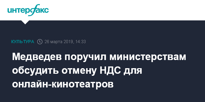 Москва. 26 марта. INTERFAX.RU - Премьер-министр РФ Дмитрий Медведев поручил Минфину, Минкультуры и Минкомсвязи России рассмотреть до 5 июня вопрос об освобождении от НДС онлайн-кинотеатров.