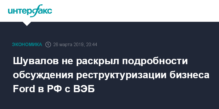 Москва. 26 марта. INTERFAX.RU - Американский автопроизводитель Ford обратился в ВЭБ с предложением по реструктуризации бизнеса в РФ, стороны обсуждают варианты, заявил журналистам председатель госкорпорации Игорь Шувалов.