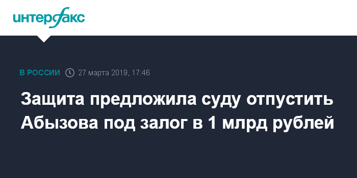 Москва. 27 марта. INTERFAX.RU - Защита экс-министра Открытого правительства России Михаила Абызова, обвиняемого в хищении 4 миллиардов рублей, попросила суд отпустить его под залог в 1 млрд рублей или поместить под домашний арест, передал корреспондент "Интерфакса" из Басманного суда.